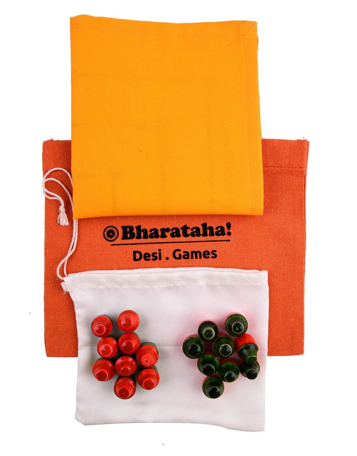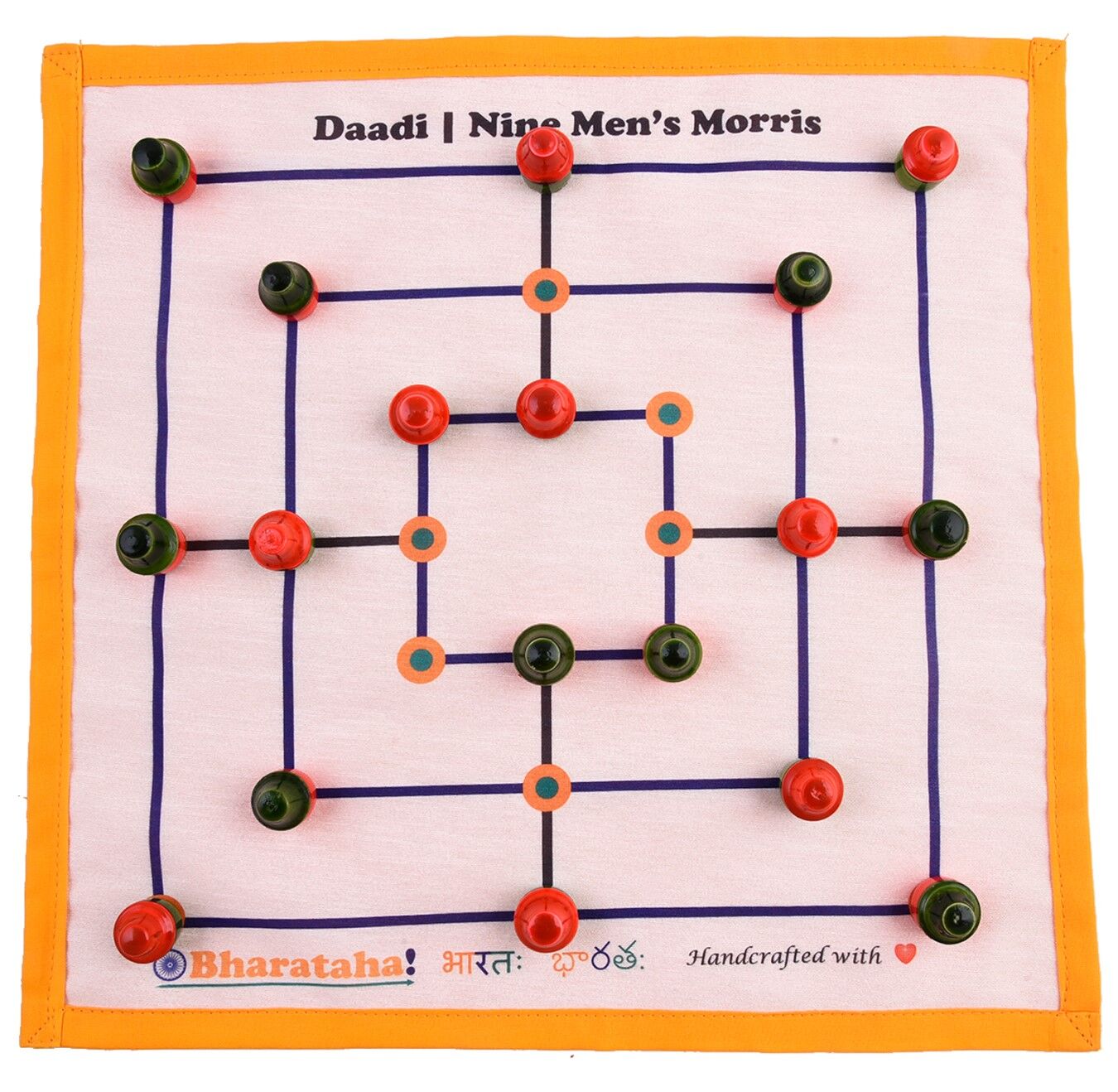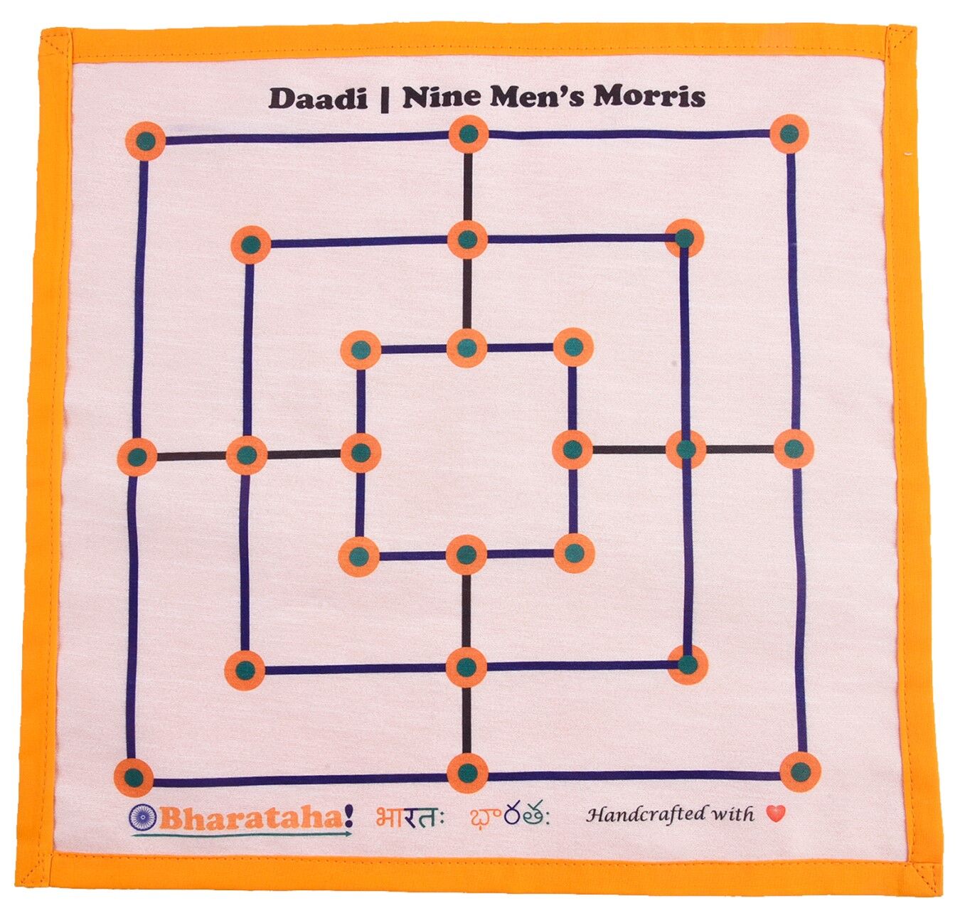 Daadi: A board game testing skills in strategy and planning. Played by two players. Suitable for children over five and adults. Most of these games have presences in different parts of the world. This game in the West is called Nine Men’s Morris. In India itself, it is played under names such as Navkankari, Muhle, and Daadi across different regions. A strategy alignment game where the aim primarily is to get as many points as possible by getting three coins in a row. The Two opposing players are given 9 coins each of two different colors. The players try to move them to get 3 coins in a row. While similar in movement to noughts and crosses, this game is far more complex. The basic aim of a player is to make vertical or horizontal lines with three coins of one color. Every time this is achieved, one of the opponent’s coin is removed. The ultimate objective is to bring the opponent’s coins down to two, or to block all the opponent’s moves, thus rendering the opponent unable to play. When such a final block occurs, the person creating the block is declared the winner.