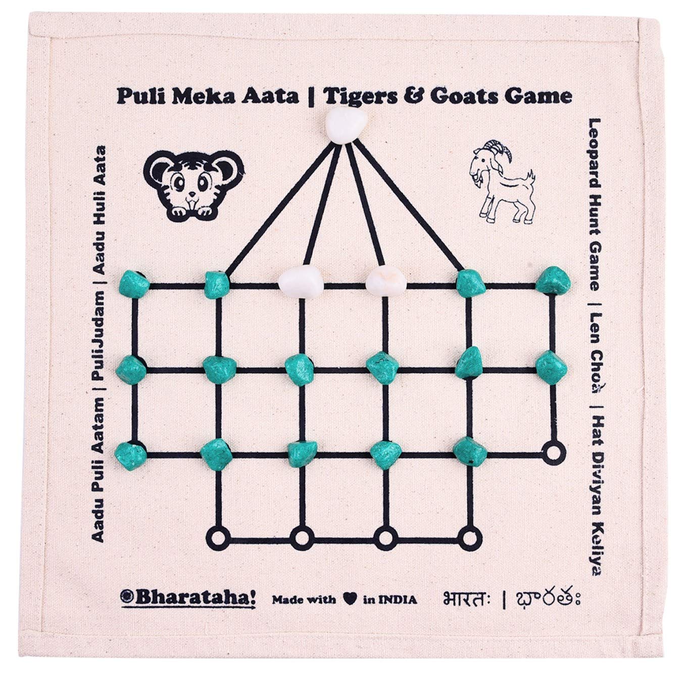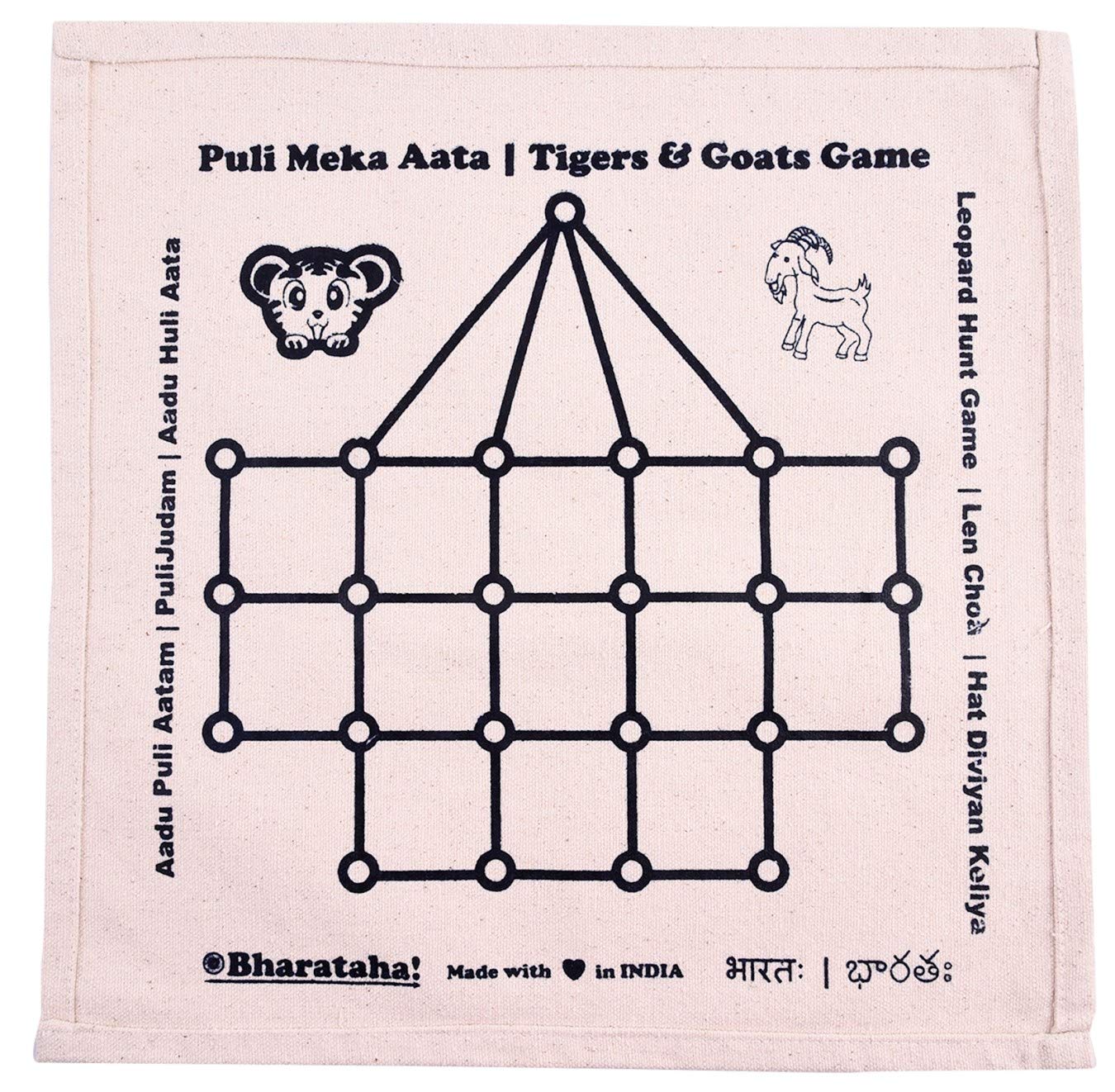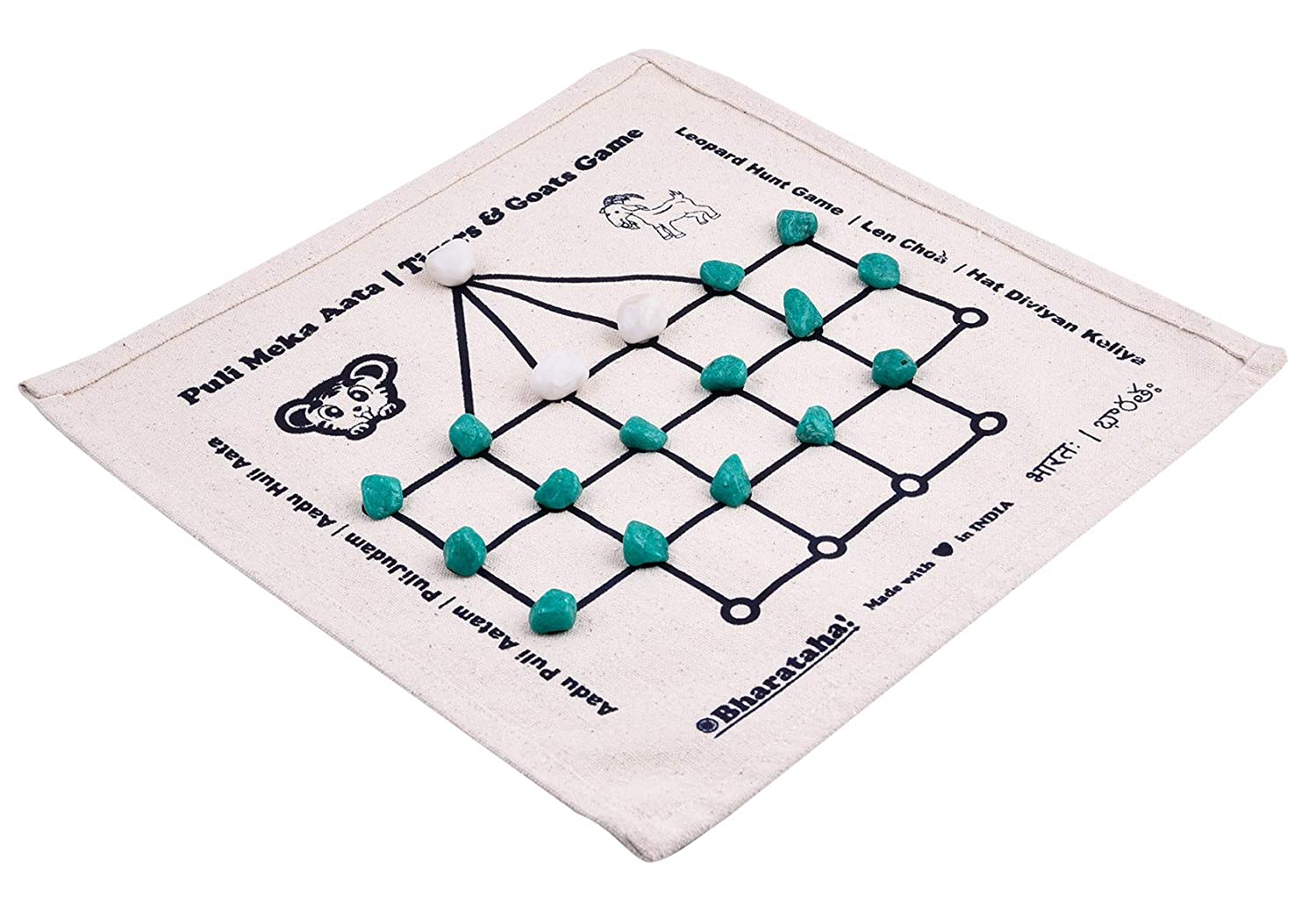 Puli Meka Aata (goat and tiger game) is a strategic, two-player (or 2 teams) board game. This game improves Tactical Planning, Coordination Skills, Dynamic Thinking, etc. The game is asymmetric in style. One player controls three tigers and the other player controls up to 15 goats. The tigers Hunt the goats while the goats attempt to block the tigers ‘ movements.